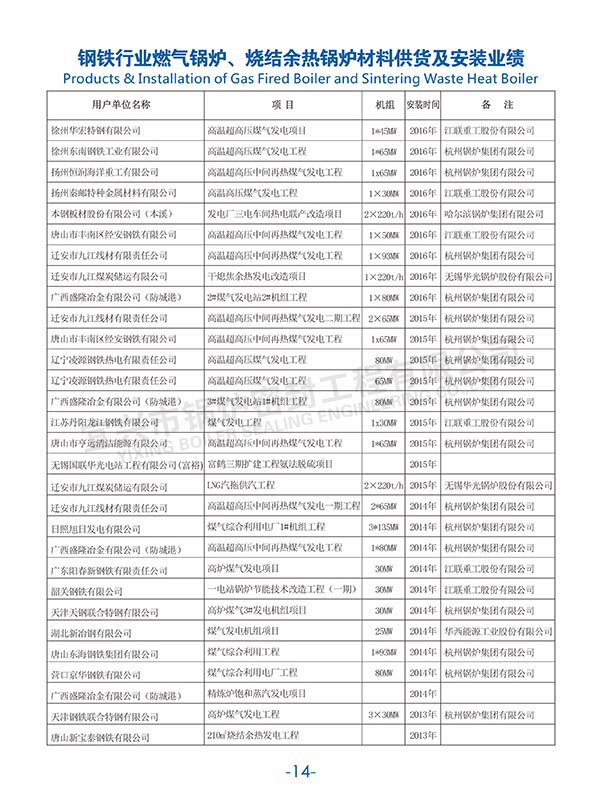 鋼鐵行業(yè)燃?xì)忮仩t、燒結(jié)余熱鍋爐材料供貨及安裝業(yè)績(三)