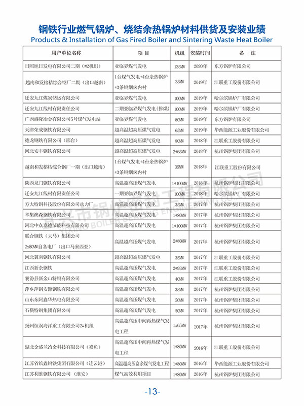 鋼鐵行業(yè)燃氣鍋爐、燒結(jié)余熱鍋爐材料供貨及安裝業(yè)績(二)